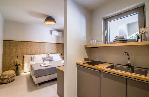 Enjoy your holidays on an elegant suite with minimalist decoration that creates a sense of serenity. It is builded with an open space between rooms and has a stylish kitchen with a hob, fridge and nespresso coffee machine! It has a large, comfortable double bed . Last but not least, there is stunning garden view so you can enjoy your time during the day. The suite is really suitable for couples.