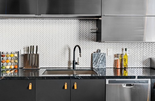 A modern, fully equipped kitchen with built in appliances and everything you need including air fryer, rice cooker, blenders and processors, coffee maker with frother, all necessary utensils and silverware.