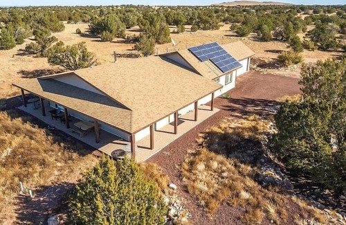 Disfruta de los grandes cielos, la vida salvaje y la vida rústica del campo del Gran Cañón. Convenientemente ubicado a 45 minutos de la entrada del Gran Cañón, manténgase en estilo en esta casa moderna de 3000 pies cuadrados con 3 dormitorios principales, 2 salas de estar, cocina grande y comedor al aire libre, comedor y porche cubierto. Ideal para grupos grandes y con vistas a 36 acres de tierra, experimentará todo lo que el área tiene para ofrecer, incluida la vida silvestre, el ferrocarril del Gran Cañón y una vida única fuera de la red. La casa está configurada con juegos y entretenimiento para toda la familia. Tenga en cuenta que las instrucciones de los mapas de Google no son precisas. La casa está a 5 minutos al oeste de la autopista 64 y es fácilmente accesible con cualquier tipo de vehículo.