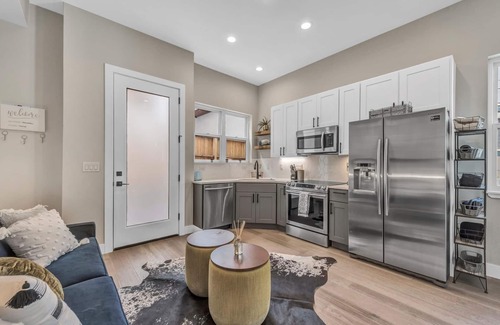 Todos los muebles nuevos de alta gama. El espacio es luminoso y brillante con techos extra altos y una magnífica estética de Modern Farmhouse. Perfecto para 1-2 parejas que viajan con mucho espacio para extenderse. Este gran 1 dormitorio se siente como un verdadero hogar. Relájese en la sala de estar principal y vea una película en la Smart TV de pantalla plana con Netflix. El sofá Queen Sold se despliega para dormir 2 personas más. Disfrute de una noche perfecta de sueño en el acogedor dormitorio principal con persianas opacas y vestidor grande. Nueva lavadora y secadora para su uso también.