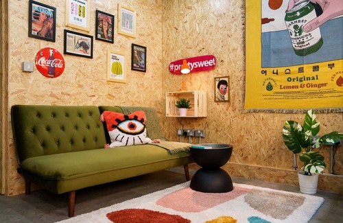 El salón está lleno de encanto, con una decoración atrevida y ecléctica y vibrantes estallidos de color. El acogedor sofá verde le invita a relajarse, mientras que el arte de la pared y los toques de inspiración vintage aportan un ambiente lúdico y elegante. Manténgase conectado con la conexión Wi-Fi de alta velocidad y disfrute del entretenimiento en el televisor de pantalla plana de 42 pulgadas, con Netflix y televisión en directo.