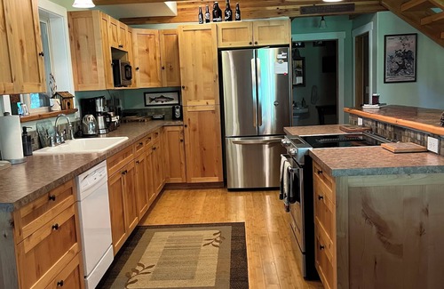 Esta cabaña lo tiene todo. Al menos, todo lo que necesitarías en un hogar dulce lejos de casa. Techos abovedados, chimenea de gas, cubierta cubierta, pisos de bambú, sofás de cuero, obras de arte locales y fotografía. El loft abierto cuenta con un futón con un televisor de pantalla grande completo con una colección de DVD con los favoritos de todos. El entorno perfecto para una barbacoa familiar, en el exterior tiene una parrilla y una vista, y en el interior de la cocina está completamente equipada con todo lo que necesita para ser un chef, panadero o asador extraordinario.