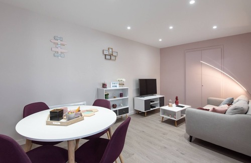 Hermosas dos habitaciones de 4 camas en el corazón del hipercentro, Place de Metz. La calidad de su renovación y su ubicación de elección le harán pasar una estancia agradable en la capital de los Alpes. - Una habitación Cama doble 140x190. Accesible desde el dormitorio: un balcón con una mesa y dos sillas - Un sofá cama salón TV de pantalla plana con suscripción NETFLIX + Wifi - Cocina abierta al salón totalmente equipada con lavadora