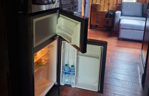 High end tiny home. Queen bed in loft with sink, storage, and fire escape! Double bed couch in living room with high ceilings, smart TV, and a huge bay of windows to expose serene views of pasture, and French doors to reveal Ewok style - gorgeous forests. Kitchen has double stove and separate oven, pour over coffee carafe with grinder, dorm size fridge, air fryer, and cutlery basics. Bath is equipped with a full-size shower, sink, and 'airhead' high efficiency, ultra-modern, odor free composting toilet.