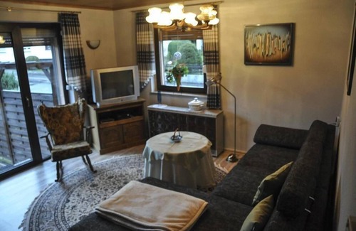 This ground-floor apartment with a private terrace is especially to be recommended for guests who are physically restricted. It is decorated and furnished in a rustic country house style and you can enjoy a comfortable holiday within 65m² of living space, comprising a bedroom with a double bed, a separate kitchen-diner, a bathroom and a living room. The bedroom has a comfortable double bed (180 x 200cm) with two separate mattresses each 90cm wide. You can adjust the height of the bed electronically by remote control. There are bedside tables with reading lamps on either side, so you can read a good book before going to bed. There is a little TV next to the three-door wardrobe with plenty of storage space for your luggage. The bathroom has a walk-in shower with a shower curtain, a washbasin with an illuminated mirror and cupboard, and a WC. The fully-equipped kitchen-diner has a cushioned corner bench and two chairs for dining together.. The dishwasher, a stove with an oven, a fridge and freezer, and all the usual small electrical appliances (coffee machine, kettle, toaster) enables comprehensive and convenient self-catering. The centrepiece of the apartment is the living room, which has a sofa bed and can therefore be used as a second bedroom. Next to the TV there is a door leading out down two steps to the terrace.