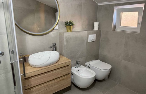 The holiday apartment is located in a single-family home built in 1990, was renovated in 2012 and is furnished in a typical country style. The property is located in a residential area. Also due to its quiet and sunny location the domicile is popular. Available for your exclusive use: terrace.LocationPoreč. The holiday apartement is located on a 80 sqm enclosed garden plot with flowers and trees, bordered by a fence and a hedce. The landlord lives permanently in the house, but uses a seperate entrance. Access is via a side road (asphalted). Parking is available on the street in front of the house. SpecialFacilities: internet access (WLAN). Dogsnot allowed. DistancesShopping 100 m, restaurant 10 m, town center 700 m. The nearest public transport stop is 800 m away. thermal bath in Istarske toplice 55 km. Porec: indoor swimming pool, sauna each 1000 m. discotheque 3 km and cinema 700 m. railway station in Rijeka 90 km. Railway line 700 m. Children's playground 3,2 km. In summer: Adriatic Sea 1,7 km (beach 700 m in Porec featuring stones, rocks and bathing plateaus). Porec: tennis, golf each 1000 m. mini golf, horse riding each 3 km. fishing, diving, boat rental, boat launch each 700 m. DivisionHoliday apartment, 2 floors, 4 rooms (including 2 bedrooms), 80 sqm, in total 4 beds. RoomThe entrance to your holiday apartment is located on the 1st floor