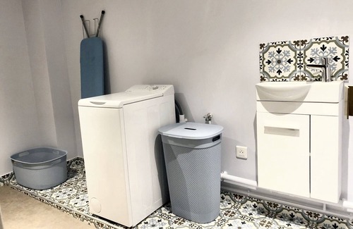 The studio features a washing machine, ironing equipment, cleaning products, a vacuum cleaner and a dressing room.