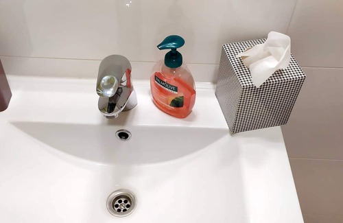 The apartment features ironing equipment, cleaning products and central heating.
