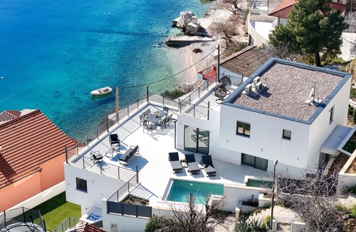 En esta espaciosa villa de la costa dálmata le espera un descanso inolvidable en una ubicación privilegiada directamente sobre el mar azul turquesa. El elegante interior combina un diseño minimalista con cálidos elementos de madera y colores suaves. Prepare sus platos favoritos en la cocina americana y tome asiento en la elegante mesa de comedor. Relájese en la sala de estar de planta abierta y termine el día con una tarde de cine o una buena conversación.