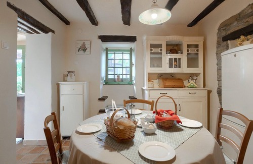Disfrute de una estancia agradable en esta casa de vacaciones tradicional y rural con piscina. Disfrute del bello ambiente de los alrededores del pueblo. Dispone de una zona de estar en la planta baja y dormitorios en la planta baja. Junto a la piscina hay un anexo con baño, cocina y una zona de barbacoa muy bien amueblada. La casa tiene un certificado Eco Domus y es ideal para la vida al aire libre y sus alrededores para unas vacaciones activas en la naturaleza.La gran terraza cubierta le ofrece una hermosa vista de las montañas Ucka, campos y colinas, así como el jardín con piscina. Disfrute de deliciosas especialidades de la parrilla a la sombra con una buena gota de vino de los viticultores locales. Los veraneantes activos pueden practicar senderismo y ciclismo, así como parapente. Junto a la piscina hay un cuarto de baño adicional.