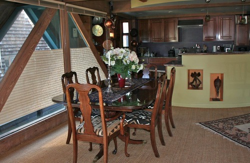 Nivel medio: perfecto para entretener a grupos grandes o pequeños. Entras en un vestíbulo, luego continúas pasando un atrio de dos pisos hasta una espaciosa sala de estar y un comedor con muebles de calidad y objetos de arte. En el extremo derecho hay un gran asiento junto a la ventana que se puede usar como una cama individual, que da al hermoso monte. Tamalpais Directamente desde la cubierta principal a través de puertas correderas está nuestra "casa de la rueda" decorada con la rueda de un yate francés. La cocina de última generación está totalmente equipada y tiene mostradores de mármol personalizados, estufa profesional, electrodomésticos, mostrador para dos personas. Un hermoso baño de decoración asiática con bañera de hidromasaje completa este piso. Abundan los artefactos de buen gusto ya que los propietarios son un ex diplomático y un ejecutivo de viajes con experiencia en antropología.