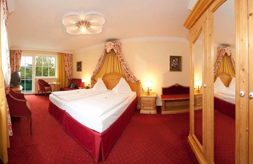 Junior Suite, ca 36m ², vista al pueblo y montañas, lado oeste, valiosos equipos de madera vieja, dos camas adicionales posibles, antesala de guardarropa, armario grande, cama doble separable, baño grande, secador de pelo, inodoro separado, calefacción por suelo radiante, caja de seguridad, TV, internet, balcón