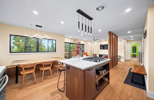 The dining area has a stunning live edge table with built in benches while the adjoining living room creates a cozy space for rest. The wall of glass doors takes center stage here in the living area, where the doors can be slid back (accordian style)into the wall creating a seamless opening between the outdoor deck space and the indoor living spaces and allowing the serene views of the woods inside. The gas fireplace adds to the comfort of this simple living space.