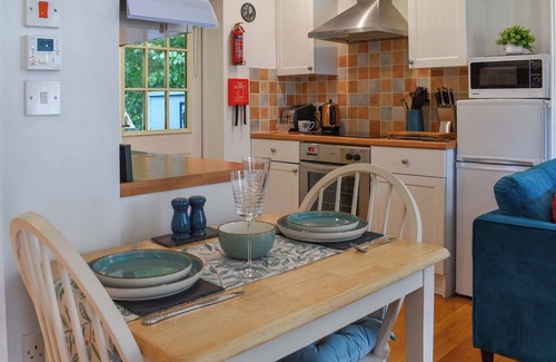 Here, a cosy sofa and plush armchair invite you to relax with a book or film, while the intimate dining area sets the scene for leisurely meals. The well-equipped kitchen makes cooking a pleasure, opening directly onto your enclosed private garden, where the river winds gently past — its soft murmur a constant, soothing backdrop.