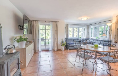 5-sterren vakantiewoning met 2 slaapkamers, betegelde vloeren, zuidwestelijk terras, inclusief sauna-wellnessoase, zwemvijver, overdekte parkeerplaats. Wifi