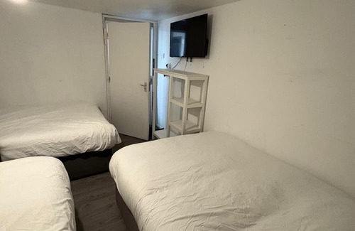 Bedroom1 : This spacious double bedroom includes TV, double and single beds and shelf to put items on and hanger for clothes.