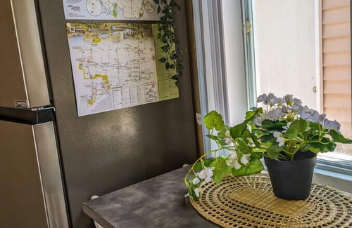 Los alojamientos con aire acondicionado de Les Chalets Bleus - Cozy rental by the riverine - Cottage 1 disponen de secador de pelo. Las habitaciones disponen de balcón. El mobiliario se compone de sofá cama y mesa de comedor. La cocina está dotada de frigorífico, microondas, utensilios de cocina y cafetera y tetera.