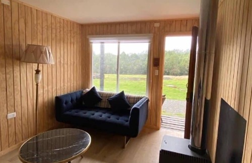 Living con increíble sofá, Smart TV, Wifi disponible y calefacción a leña ya que la cabaña cuenta con bosca.