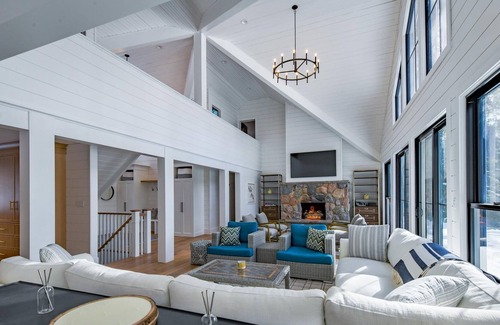 Al ingresar a esta cabaña, será recibido por la gran sala de concepto abierto con su piso a piso. techo de piedra, chimenea a gas con televisión arriba, pared de ventanas para una vista fantástica del lago y salida a la terraza. Las ventanas de guillotina doble en los salones Great y Dining lo harán sentir como si estuviera sentado afuera.