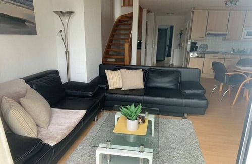 The holiday apartment is located in a well-maintained apartment building directly on the beach in Holnis. It can accommodate a total of 6 people. The property is on the 1st floor. The bright and very spacious living room offers a large dining area and a seating area with two leather sofas. These can be used as sofa beds. The balcony is furnished and, like the living room, offers direct sea views. The beach is directly in front of the holiday home. The kitchen is integrated into the living room and has everything guests need for self-catering. A dishwasher is available. The bedroom on the 1st floor is furnished with a double bed, wardrobe, and chest of drawers and facing the rear, towards the meadows. This bedroom also has a small balcony. The second bedroom is located in the open attic and is accessed via a staircase in the living room. This upper sleeping area is open, like a gallery. It is also furnished with a double bed and a wardrobe. Two large skylights and the gallery provide plenty of light. A desk and a recliner are also available for our guests. The shower room on the first floor is also equipped with a washing machine. A private parking space is available at the holiday home.