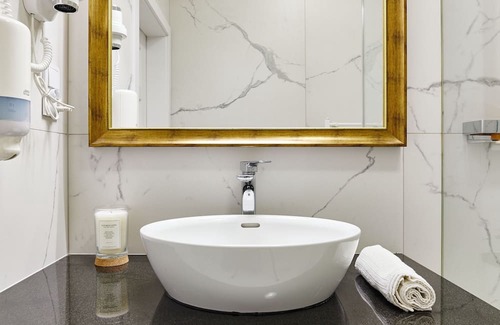 Bathroom with walk-in shower, hairdryer, and premium toiletries