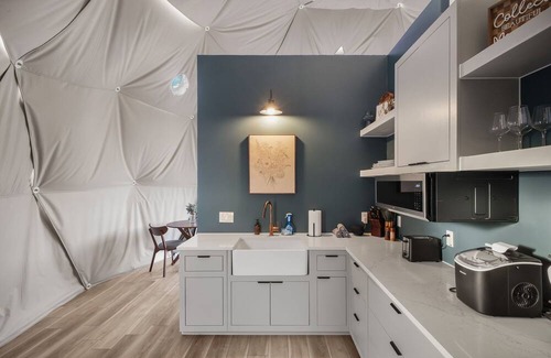 Our domes feature smart locks for seamless, flexible check-in, fully stocked kitchens with mini fridges, hot plates, quartz countertops, and large sinks, plus a cozy eating area. The king-sized memory foam mattress promises restful nights, with built-in drawers for storage and a selection of board games. Nightstands double as spacious wardrobes for your essentials, and at the push of a button, the footboard reveals a 50" smart TV for cozy evenings in, or hides away to showcase the panoramic Hill Country views, complete with curtains for privacy. Gaze at the stars through the openable massive skylight window above, inviting the magic of Hill Country nights.