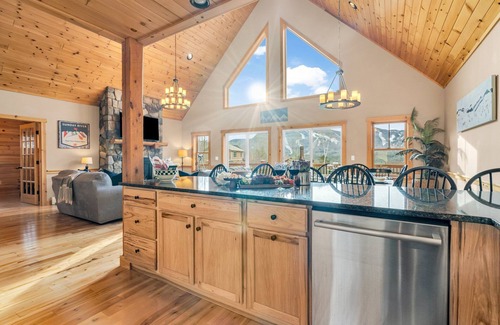 The living room, kitchen, and dining area provide a warm and inviting space for relaxation and togetherness. The living room features two plush couches and stunning vaulted ceilings, creating an open and cozy atmosphere. The dining area includes a table that seats six, with four additional barstools at the kitchen bar for casual seating. The fully stocked kitchen is equipped with pots, pans, a spice rack, and everything you need to whip up a delicious meal. To top it off, this space offers breathtaking views of the ski slopes, making it the perfect spot to gather and unwind.