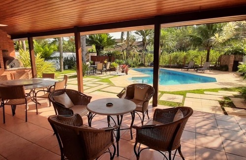 Casa con estilo y bien decorada, muy cómoda para hasta 10 personas, muy cerca de dos hermosas playas Domingas Dias y Lázaro (150mts) con piscina privada, asador y horno de pizza, con garaje para 4 autos, dentro de un condominio con seguridad las 24 horas. y en medio del bosque atlántico con vista a las montañas.