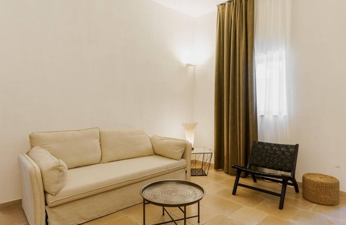 The first Trullo Suite with independent entrance and consists of a single room with a double bed in an alcove, children's bed/sofa, small desk and ensuite bathroom with shower.