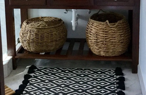 Cada cabaña tiene su propio baño completo con una encimera de mármol, un tocador local hecho a medida y el azulejo del piso de la ducha del baño está hecho de piedras de río mexicano.