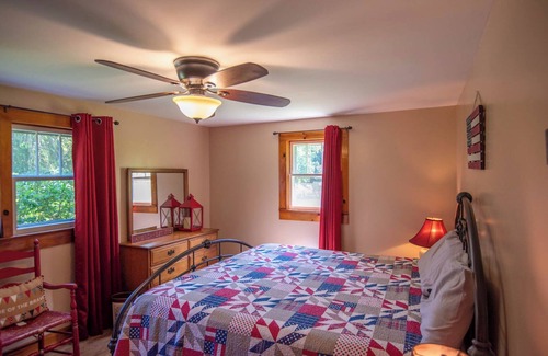 La casa de campo tiene capacidad para seis personas, con 3 habitaciones que ofrecen una cómoda cama tamaño King en una, Queen en otra y una completa en la tercera. Los edredones en la cama te hacen retroceder en el tiempo. En una verdadera casa de campo vintage, comparten un baño. Los pisos de madera en toda la casa de campo se suman al encanto y disfrutará de los sonidos de la lluvia en el techo de metal.