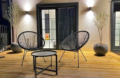 A stylish studio room (w/ private bathroom and patio garden) in a brand new 2022 boutique villa located in the historic old town of Ohrid overlooking the port and the main square.