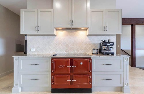At the heart of the home, the open-plan dining and lounge area is framed by sweeping hinterland views. A cosy fireplace anchors the space, creating an inviting setting for relaxation. Floor-to-ceiling glass doors open out onto an expansive entertaining deck set for alfresco dining, while the other side connects to a peaceful courtyard for relaxed conversation. Fully ducted air conditioning throughout the home ensures year-round comfort. Adjacent to the lounge, the formal indoor dining area offers a refined space for shared meals and special occasions, seating guests comfortably while enjoying views across the deck. The chef’s kitchen is fully equipped with a heritage Esse oven, espresso machine, granite and timber benchtops, and a spacious butler’s pantry. All the essentials—from tea and coffee to oils and seasonings—are provided for your convenience.