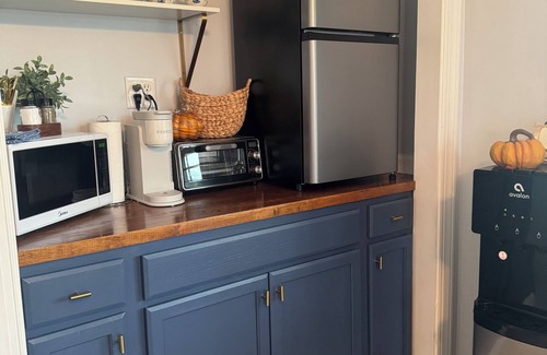 Step outside onto your private deck, with pond views, surrounded by trees and the peaceful sounds of nature—an ideal spot to enjoy your morning coffee or unwind in the evening. Inside, relax in the comfortable living area with a TV and cozy seating, or prepare light meals in the well-equipped kitchenette featuring a mini fridge/freezer, microwave, air fryer/toaster oven, coffee maker, and basic utensils.