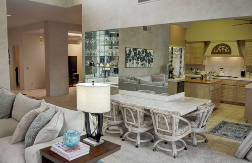 El salón tiene mucho espacio para los huéspedes con un nuevo y cómodo sofá seccional y un nuevo televisor de pantalla plana. LR tiene una chimenea de gas, sistema de sonido portátil y una barra húmeda incorporada. Hermosa mesa de comedor de vidrio con capacidad para seis. Ventiladores de techo en cada habitación, cocina y comedor. Un montón de ropa de cama, toallas de baño y piscina, almohadas y mantas.