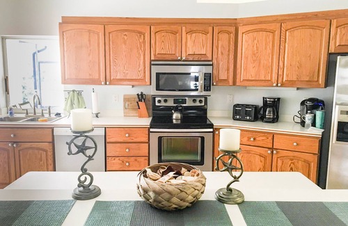 Cape Escape incluye un gran televisor LCD de 47 pulgadas con cable y un reproductor de DVD. Hay 4 televisiones en toda la casa. También se proporciona acceso inalámbrico a internet de banda ancha. La cocina está equipada con los electrodomésticos de cocina habituales, lavavajillas, cafetera, cafetera y Keurig. Disfrute de una taza de café por la mañana mientras observa la salida del sol sobre el lago Thunderbird. Los ventiladores de techo y el aire acondicionado central ofrecen un cómodo descanso del sol. La suite principal cuenta con un enorme cuarto de baño con bañera de hidromasaje, ducha separada, lavamanos doble y vestidor. Las puertas corredizas de la terraza ofrecen una hermosa vista de la piscina y el lago y ofrecen un fácil acceso a la piscina para un baño matutino. Silla alta, ropa de cama y toallas de baño / piscina se proporcionan.