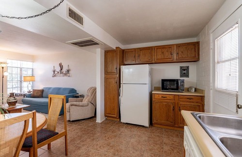 POOL right in front with open view to architectural front-facing villas across the way. The bathroom has a new wall-to-wall vanity with lots of counter space. With amenities like WiFi, AC, and a full-size washing machine. Spacious patio with large grill in front. 3 minute walk Walgreens and the Bank, and across the street from the bank are restaurants, shops and Farmers Market on Wednesday - super easy walk. This is an interior villa and not on the semi-busy street or in the parking area so it is quiet and peaceful. You can't ask for more with location, pool, washer dryer, large counter, and walk to restaurants. Come and stay a while. One person must be 55+.