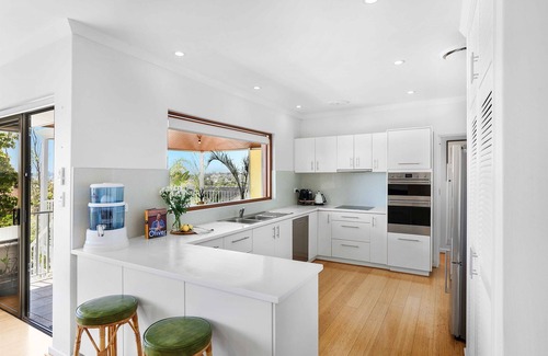 Next up is the amazing private pool. Inspired by Palm Springs, the stylish backyard features sun loungers, succulents, breeze blocks, and even a mini diving board. You'll feel like you've been transported to the Californian desert, enjoying a resort-like holiday in your own backyard. And when it's time to dine, the property has plenty of options . The upper deck outdoor dining area features its very own pizza oven, while the downstairs poolside undercover dining area provides the perfect backdrop for a family dinner or evening poolside sundowner.