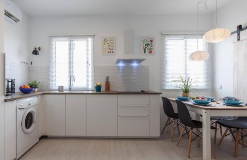 Precioso apartamento reformado. Tiene capacidad para 4 personas. Dispone de dos cuartos amplios, los dos con nuevas y cómodas camas en una 2 camas individuales de 080x200cm cada una y en la otra de matrimonio de 140x200 cm. Es perfecto para parejas, familias con o sin niños y amig@s. El baño cuenta con dispensadores de geles para su comodidad. La cocina está completamente nueva y equipada con electrodomésticos y utensilios para cocinar. Además dispone de lavadora para uso de nuestros huéspedes. Cada estancia dispone de un aparato de aire acondicionado frio/calor.