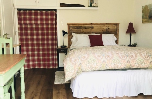 El dormitorio tiene una cama queen con una elegante decoración de granero con una pequeña cocina para preparar un desayuno informal y preparar bebidas. Acuéstese en la cama o siéntese disfrutando de su noche / mañana con el control deslizante francés abierto al patio iluminado. * Las luces exteriores están encendidas en el temporizador para apagarse alrededor de las 10:30 p.m. Nos complace ajustar el tiempo para su comodidad.