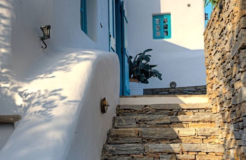 Villa Dafni (around 45 m2) is a 1 bedroom (double bed, A/C) luxury villa in Belogna ikons complex. Fully equipped kitchen. The sofa bed in the living room with the fire place is large enough for any adult. Baby cot available free of charge on request. The dining table inside and outside the villa plus the garden can easily accommodate 3 adults. Panoramic views towards the Aegean sea, Naxos town, Paros, Syros and Mykonos island. Private veranda, garden and parking.