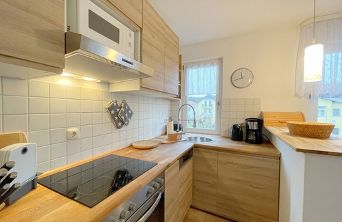 La cocina está equipada con horno, placa de cocina y frigorífico, además de cafetera y tetera, microondas y utensilios de cocina. El cuarto de baño incluye un secador de pelo y toallas. Y gracias a la lavadora y la secadora, podrás viajar con poco equipaje. Otras comodidades incluyen una sala de estar, ropa de cama, calefacción y una mesa de comedor.