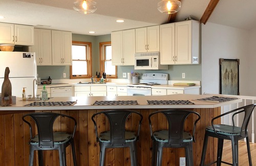 Decorado con gusto en un estilo de cabaña de playa, SEA-GO cuenta con más de 1000 pies cuadrados de cubiertas, dos en el frente y uno en la parte posterior, con vistas al nivel superior del océano desde el frente. Relájese en la hamaca grande o columpiándose en la cubierta sombreada de nivel medio. Todas las sábanas incluidas y las camas hechas a la llegada.