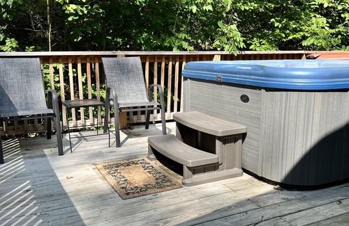 Relájate en la bañera de hidromasaje o tómate algo en el porche o patio de esta cabaña. En cuanto al interior, puedes poner a prueba tus habilidades jugando al billar, o disfrutar del wifi, de la televisión y del reproductor de DVD.