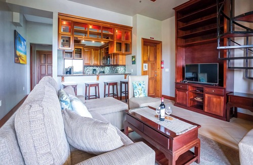 Este condominio penthouse de dos dormitorios y dos baños ubicado en el piso superior, domina los hermosos jardines y la hermosa playa caribeña. En el interior se encuentra una sala de estar espaciosa y luminosa con un toque tropical y puertas y gabinetes exóticos de caoba.