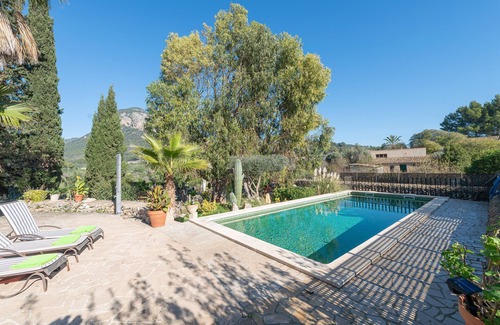 El precioso exterior, rodeado de naturaleza, cuenta con una piscina de agua salada de 10x5 metros y una profundidad de entre 1 y 2,1 metros, rodeada de cómodas tumbonas, un lugar perfecto para darse un refrescante baño mientras se disfruta de las impresionantes vistas a la Sierra de Tramuntana. Antes de entrar, encontrarás un encantador porche amueblado con sofás y una mesa para comidas al aire libre, además de una zona de barbacoa ideal para preparar y compartir deliciosos platos.