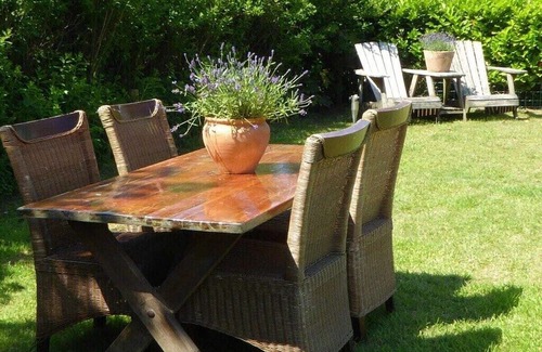 Facilities: 1 bedroom on the ground floor with 2 single beds measuring 90x200 cm placed together. 1 bedroom on the upper floor with 2 single beds measuring 90 x 200 cm placed apart or together. Living room with modern corner couch, color TV with cable connection. Open kitchen with dining area. Kitchen equipment: Electric stove with ceramic hob, no oven, refrigerator with freezer compartment, dishwasher, coffee machine, kettle, microwave, toaster. Spiral staircase leads to the upper floor. Large garden with wind-protected terrace. Garden furniture available.