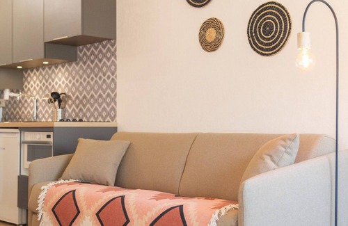 Una cocina equipada: placa vitrocerámica de 3 fuegos, horno combinado horno/microondas, cafetera NESPRESSO, lavadora, refrigerador con compartimento congelador, pack de vajilla completo, fondo de cocina y productos de limpieza.