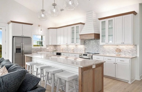 The great room has fantastic ocean views, tall ceiling, and a large flat-screen TV. The sectional sofa gives lots of space to relax after a day at the beach. The kitchen has a huge island with lots of lighting and modern appliances.