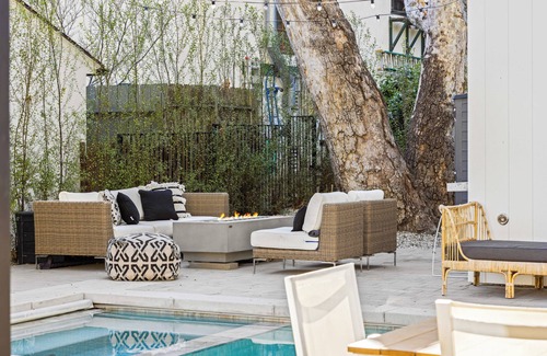 Quintessential LA indoor/outdoor living, this high end luxury home was built in 2020 with the finest attention to detail and features a separate pool house with a complete living room, kitchen, bedroom and bath. Spaces flow seamlessly throughout this property that features large glass doors from both houses that reflect across the heated saltwater pool with an oversized hot tub. The oversized patio features a fire pit, outdoor dining area, and gas grill.